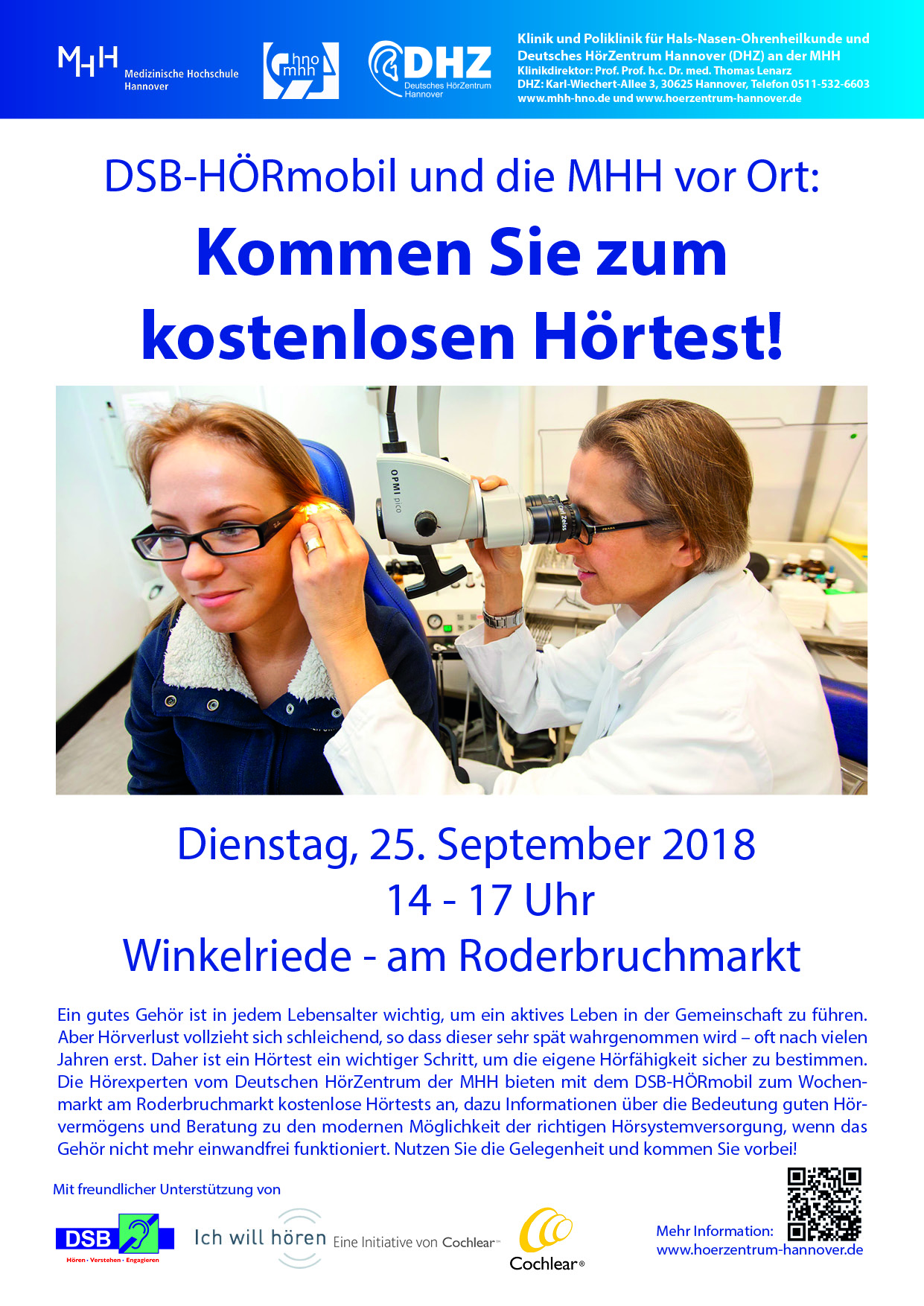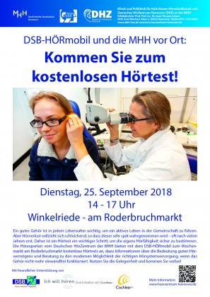 Ein gutes Gehör ist in jedem Lebensalter wichtig, um ein aktives Leben in der Gemeinschaft zu führen. Aber Hörverlust vollzieht sich schleichend, so dass dieser sehr spät wahrgenommen wird – oft nach vielen Jahren erst. Daher ist ein Hörtest ein wichtiger Schritt, um die eigene Hörfähigkeit sicher zu bestimmen. Die Hörexperten vom Deutschen HörZentrum der MHH bieten mit dem DSB-HÖRmobil zum Wochenmarkt am Roderbruchmarkt kostenlose Hörtests an, dazu Informationen über die Bedeutung guten Hörvermögens und Beratung zu den modernen Möglichkeit der richtigen Hörsystemversorgung, wenn das Gehör nicht mehr einwandfrei funktioniert. Nutzen Sie die Gelegenheit und kommen Sie vorbei!